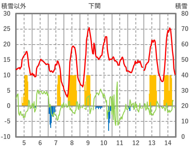 | 日 | 時 | 気温 | 降水 | 風向/風速 | 日照 | 積雪 | 降雪 |