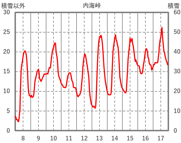 | 日 | 時 | 気温 | 降水 | 風向/風速 | 日照 | 積雪 | 降雪 |