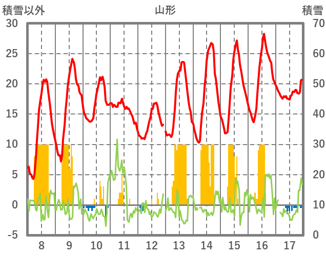 | 日 | 時 | 気温 | 降水 | 風向/風速 | 日照 | 積雪 | 降雪 |