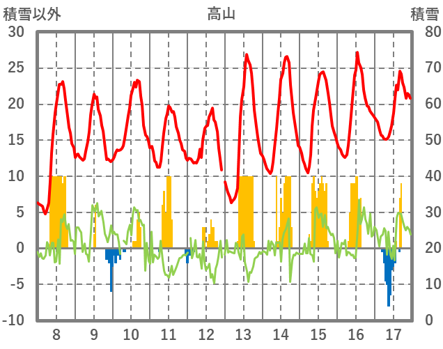 | 日 | 時 | 気温 | 降水 | 風向/風速 | 日照 | 積雪 | 降雪 |