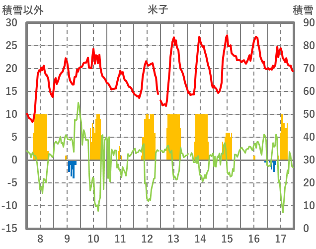 | 日 | 時 | 気温 | 降水 | 風向/風速 | 日照 | 積雪 | 降雪 |