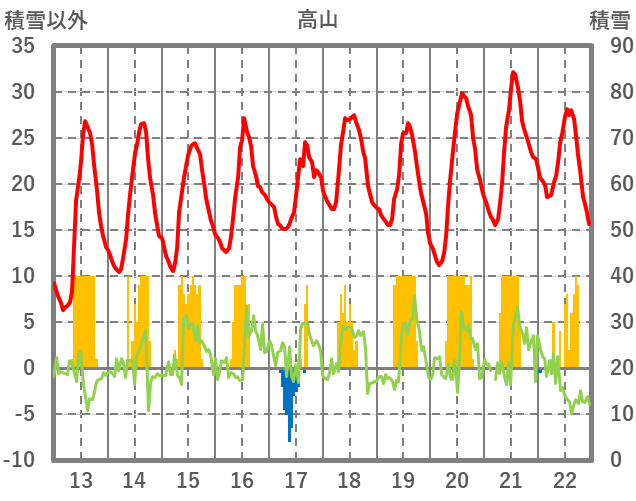 | 日 | 時 | 気温 | 降水 | 風向/風速 | 日照 | 積雪 | 降雪 |