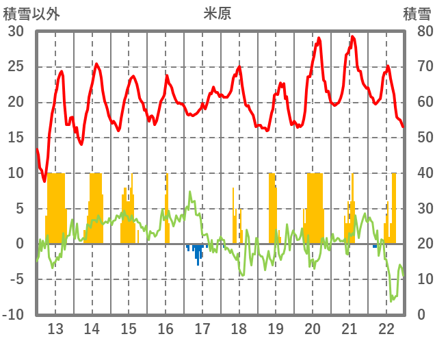 | 日 | 時 | 気温 | 降水 | 風向/風速 | 日照 | 積雪 | 降雪 |