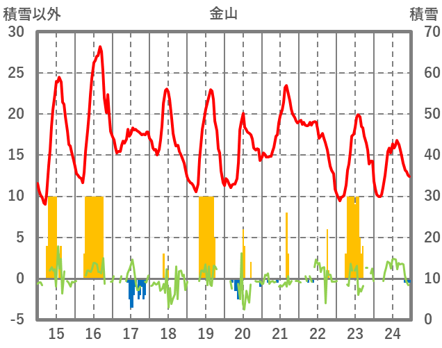 | 日 | 時 | 気温 | 降水 | 風向/風速 | 日照 | 積雪 | 降雪 |