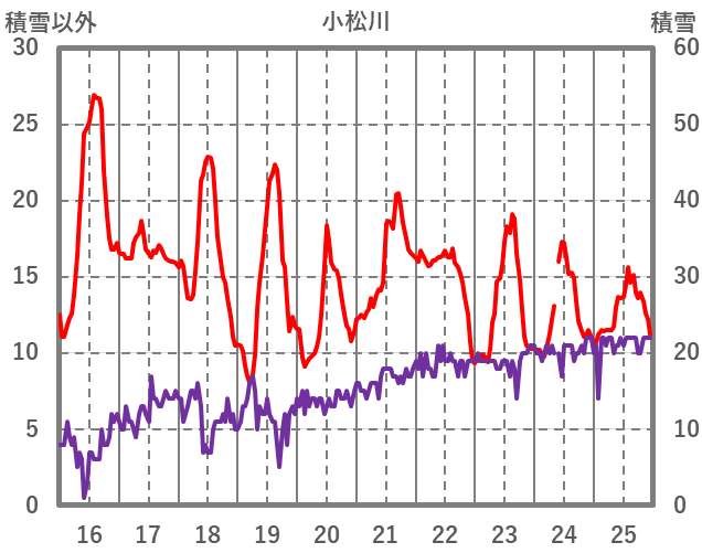 | 日 | 時 | 気温 | 降水 | 風向/風速 | 日照 | 積雪 | 降雪 |