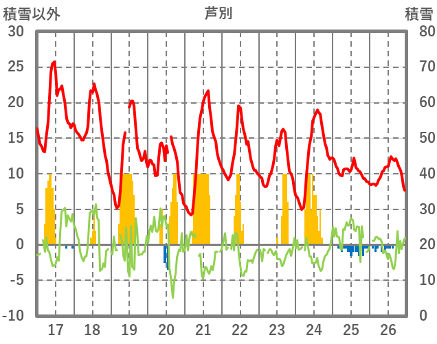 | 日 | 時 | 気温 | 降水 | 風向/風速 | 日照 | 積雪 | 降雪 |