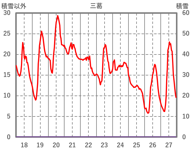 | 日 | 時 | 気温 | 降水 | 風向/風速 | 日照 | 積雪 | 降雪 |