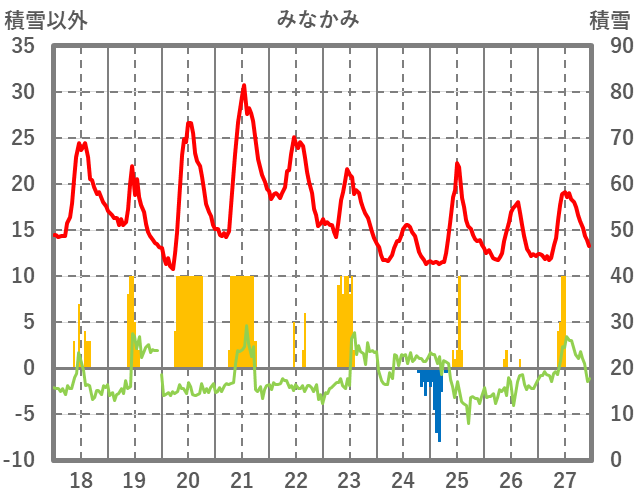 | 日 | 時 | 気温 | 降水 | 風向/風速 | 日照 | 積雪 | 降雪 |