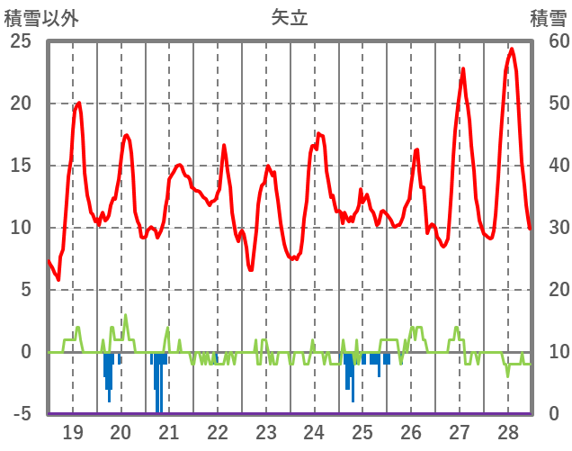 | 日 | 時 | 気温 | 降水 | 風向/風速 | 日照 | 積雪 | 降雪 |