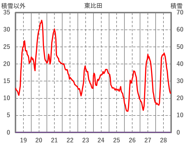 | 日 | 時 | 気温 | 降水 | 風向/風速 | 日照 | 積雪 | 降雪 |