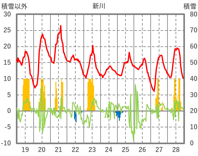 | 日 | 時 | 気温 | 降水 | 風向/風速 | 日照 | 積雪 | 降雪 |