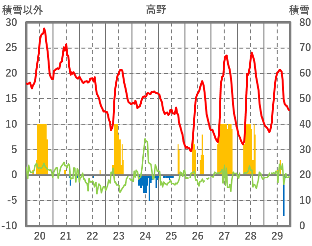 | 日 | 時 | 気温 | 降水 | 風向/風速 | 日照 | 積雪 | 降雪 |