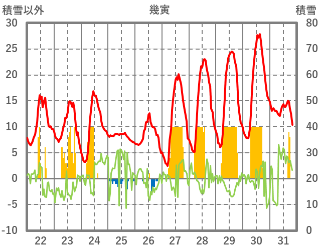 | 日 | 時 | 気温 | 降水 | 風向/風速 | 日照 | 積雪 | 降雪 |