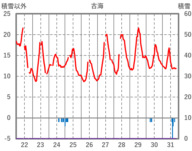 | 日 | 時 | 気温 | 降水 | 風向/風速 | 日照 | 積雪 | 降雪 |