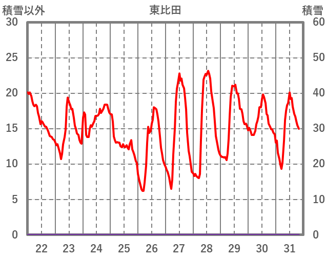 | 日 | 時 | 気温 | 降水 | 風向/風速 | 日照 | 積雪 | 降雪 |