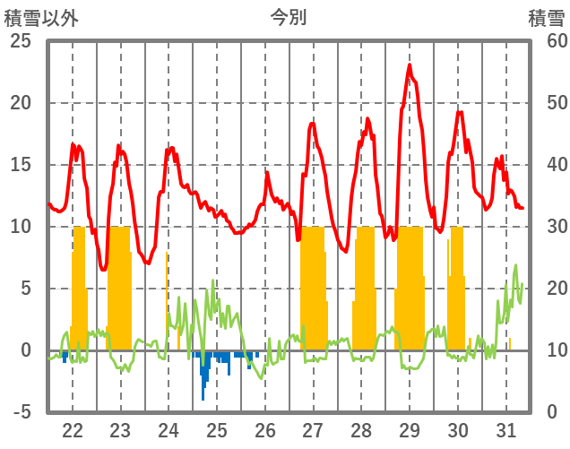 | 日 | 時 | 気温 | 降水 | 風向/風速 | 日照 | 積雪 | 降雪 |