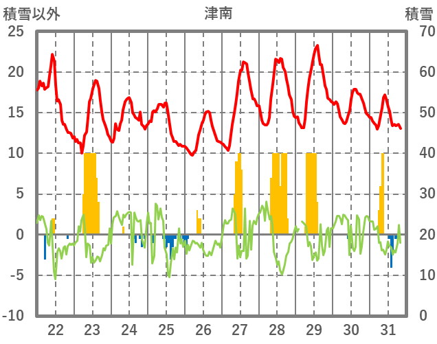 | 日 | 時 | 気温 | 降水 | 風向/風速 | 日照 | 積雪 | 降雪 |