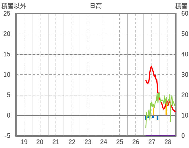 | 日 | 時 | 気温 | 降水 | 風向/風速 | 日照 | 積雪 | 降雪 |