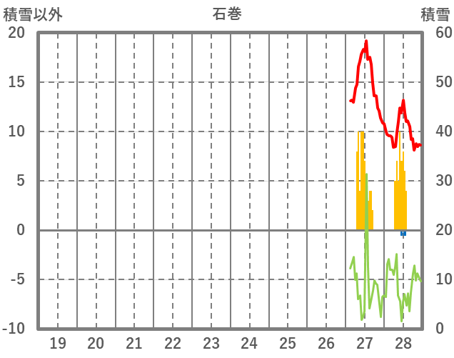 | 日 | 時 | 気温 | 降水 | 風向/風速 | 日照 | 積雪 | 降雪 |
