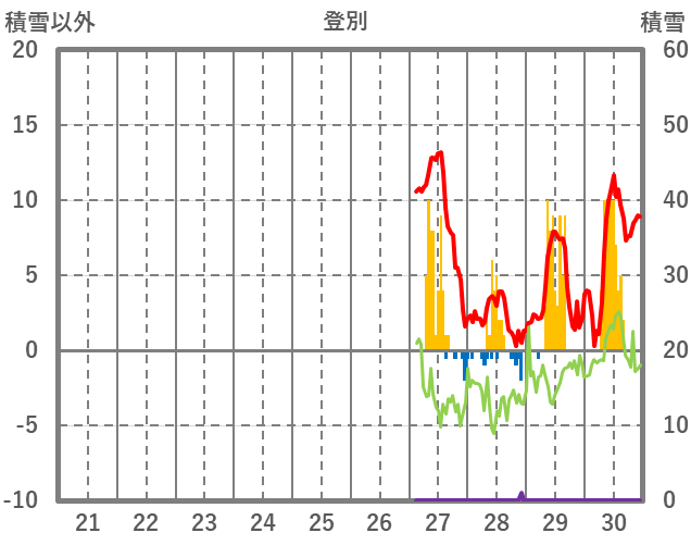 | 日 | 時 | 気温 | 降水 | 風向/風速 | 日照 | 積雪 | 降雪 |