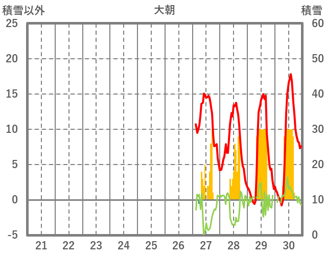| 日 | 時 | 気温 | 降水 | 風向/風速 | 日照 | 積雪 | 降雪 |