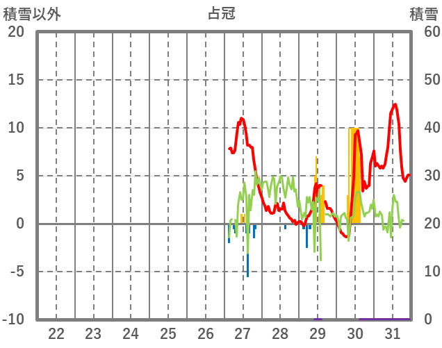 | 日 | 時 | 気温 | 降水 | 風向/風速 | 日照 | 積雪 | 降雪 |