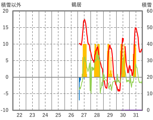 | 日 | 時 | 気温 | 降水 | 風向/風速 | 日照 | 積雪 | 降雪 |