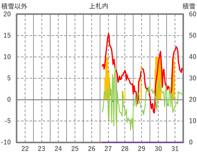 | 日 | 時 | 気温 | 降水 | 風向/風速 | 日照 | 積雪 | 降雪 |