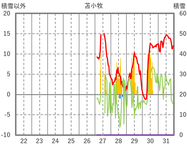 | 日 | 時 | 気温 | 降水 | 風向/風速 | 日照 | 積雪 | 降雪 |