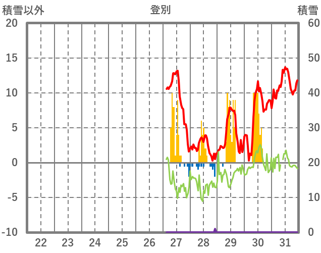 | 日 | 時 | 気温 | 降水 | 風向/風速 | 日照 | 積雪 | 降雪 |