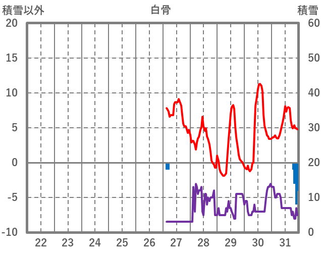 | 日 | 時 | 気温 | 降水 | 風向/風速 | 日照 | 積雪 | 降雪 |