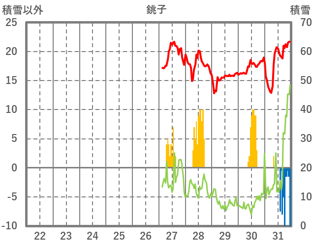 | 日 | 時 | 気温 | 降水 | 風向/風速 | 日照 | 積雪 | 降雪 |