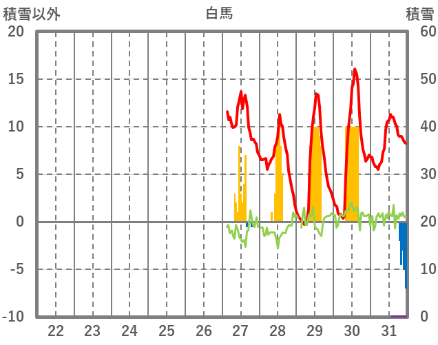 | 日 | 時 | 気温 | 降水 | 風向/風速 | 日照 | 積雪 | 降雪 |