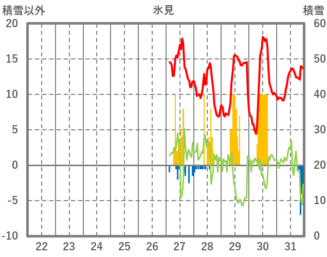 | 日 | 時 | 気温 | 降水 | 風向/風速 | 日照 | 積雪 | 降雪 |
