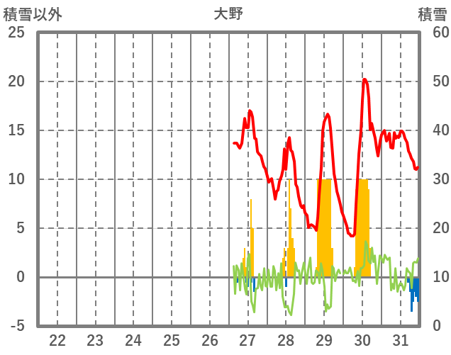 | 日 | 時 | 気温 | 降水 | 風向/風速 | 日照 | 積雪 | 降雪 |