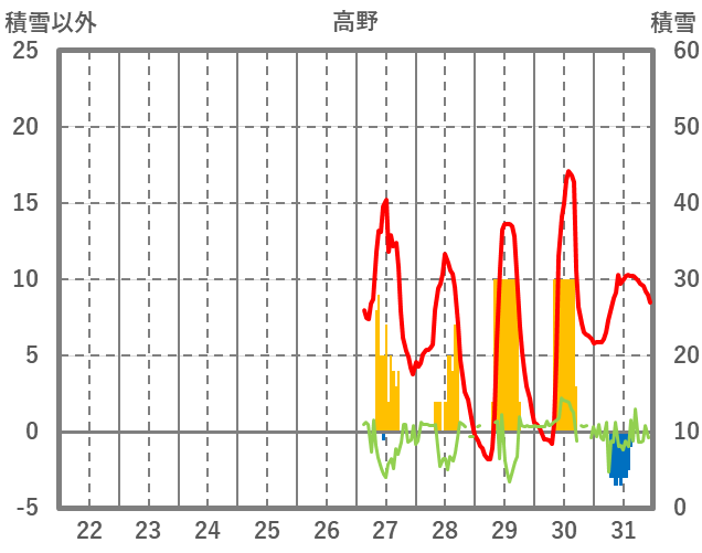 | 日 | 時 | 気温 | 降水 | 風向/風速 | 日照 | 積雪 | 降雪 |