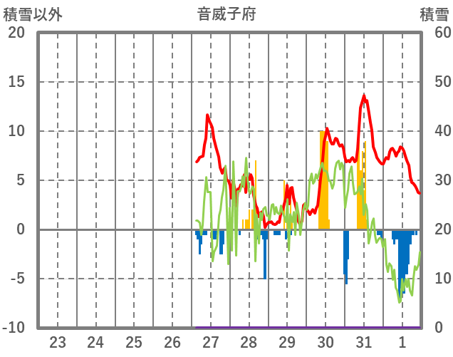 | 日 | 時 | 気温 | 降水 | 風向/風速 | 日照 | 積雪 | 降雪 |