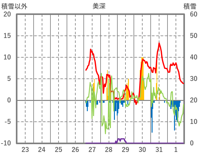 | 日 | 時 | 気温 | 降水 | 風向/風速 | 日照 | 積雪 | 降雪 |