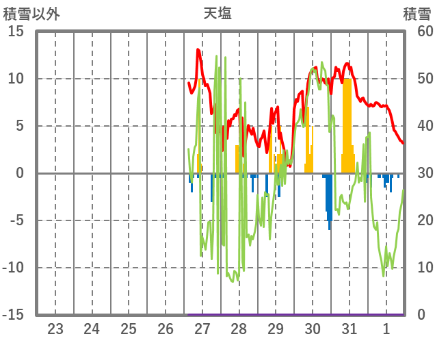 | 日 | 時 | 気温 | 降水 | 風向/風速 | 日照 | 積雪 | 降雪 |