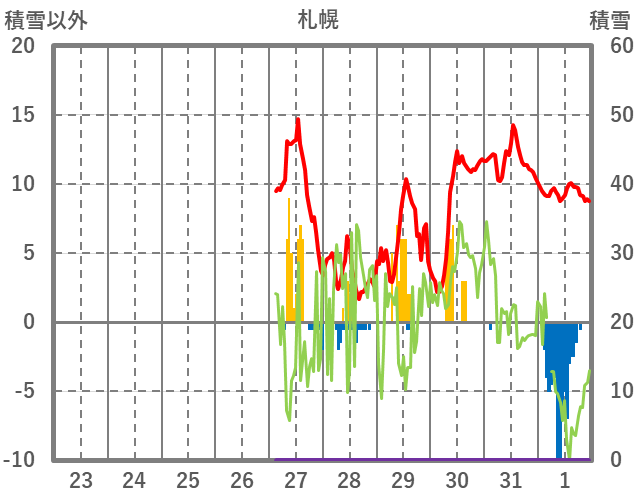 | 日 | 時 | 気温 | 降水 | 風向/風速 | 日照 | 積雪 | 降雪 |