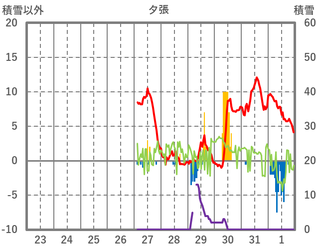 | 日 | 時 | 気温 | 降水 | 風向/風速 | 日照 | 積雪 | 降雪 |