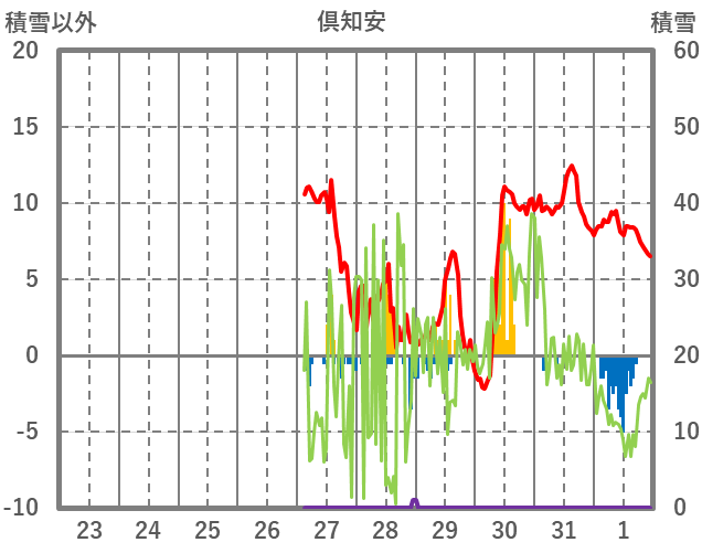 | 日 | 時 | 気温 | 降水 | 風向/風速 | 日照 | 積雪 | 降雪 |