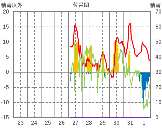 | 日 | 時 | 気温 | 降水 | 風向/風速 | 日照 | 積雪 | 降雪 |