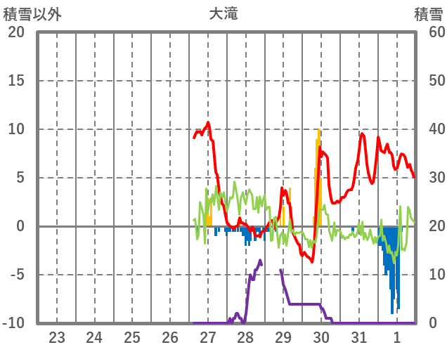 | 日 | 時 | 気温 | 降水 | 風向/風速 | 日照 | 積雪 | 降雪 |