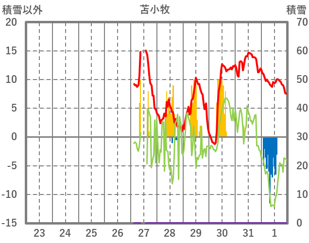 | 日 | 時 | 気温 | 降水 | 風向/風速 | 日照 | 積雪 | 降雪 |