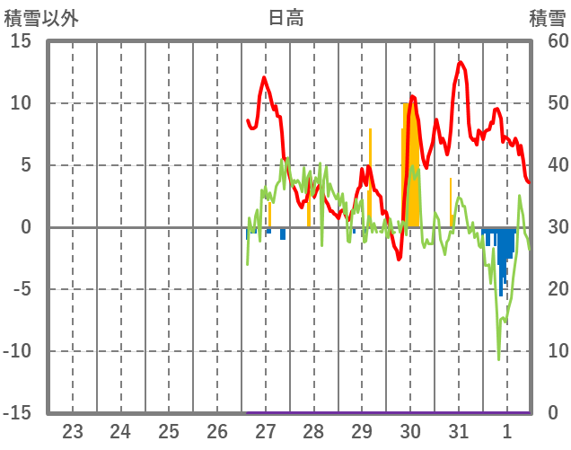 | 日 | 時 | 気温 | 降水 | 風向/風速 | 日照 | 積雪 | 降雪 |