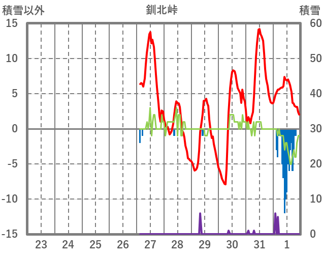 | 日 | 時 | 気温 | 降水 | 風向/風速 | 日照 | 積雪 | 降雪 |