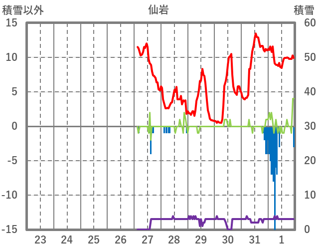 | 日 | 時 | 気温 | 降水 | 風向/風速 | 日照 | 積雪 | 降雪 |