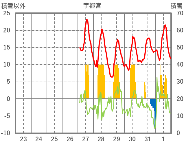 | 日 | 時 | 気温 | 降水 | 風向/風速 | 日照 | 積雪 | 降雪 |