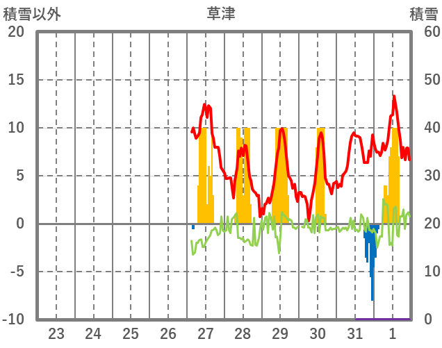 | 日 | 時 | 気温 | 降水 | 風向/風速 | 日照 | 積雪 | 降雪 |
